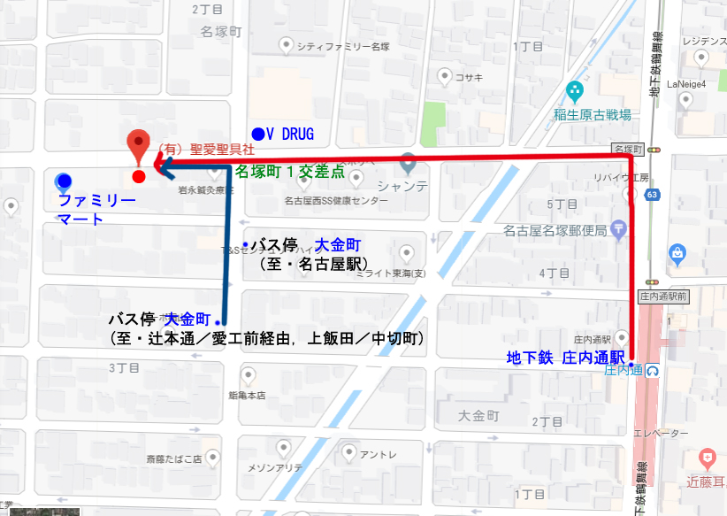 地下鉄のご利用の方:鶴舞線庄内通駅2番出口から出て左に曲がって、まっすぐ歩き、名塚交差点で左に曲がってまっすぐ歩き、信号を2個過ぎますとファミリーマートが見えます。ファミリーマートの手前3軒目が聖愛聖具社です。